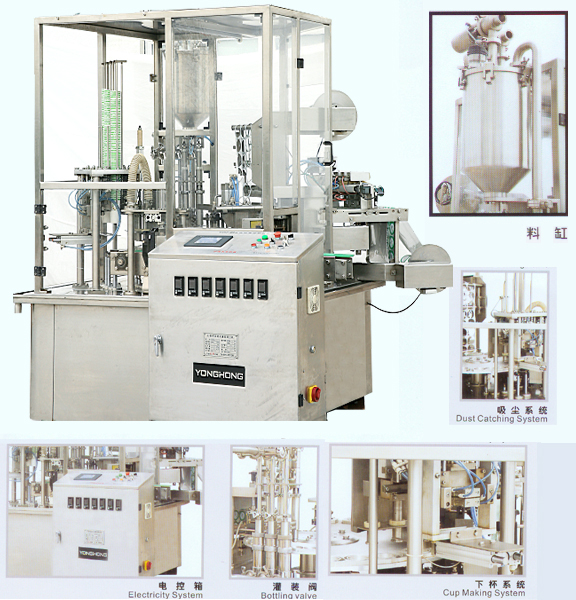 本機(jī)器是專(zhuān)為紙杯、塑料杯而設(shè)計(jì)的灌裝封口機(jī),集機(jī)械手下杯、頂杯灌裝、制蓋、封口、卷邊等為一體的自動(dòng)化設(shè)備,可灌裝果粒,采用進(jìn)口氣動(dòng)原件,人機(jī)界面控制,具有占地面積小、自動(dòng)化程度高等優(yōu)點(diǎn)。